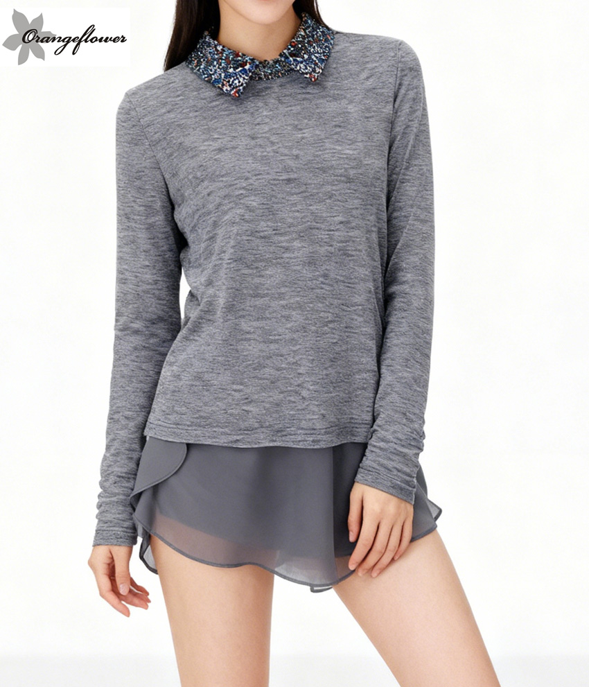 orange flower欧美风格显瘦修身减龄假两件套针织拼雪纺拼